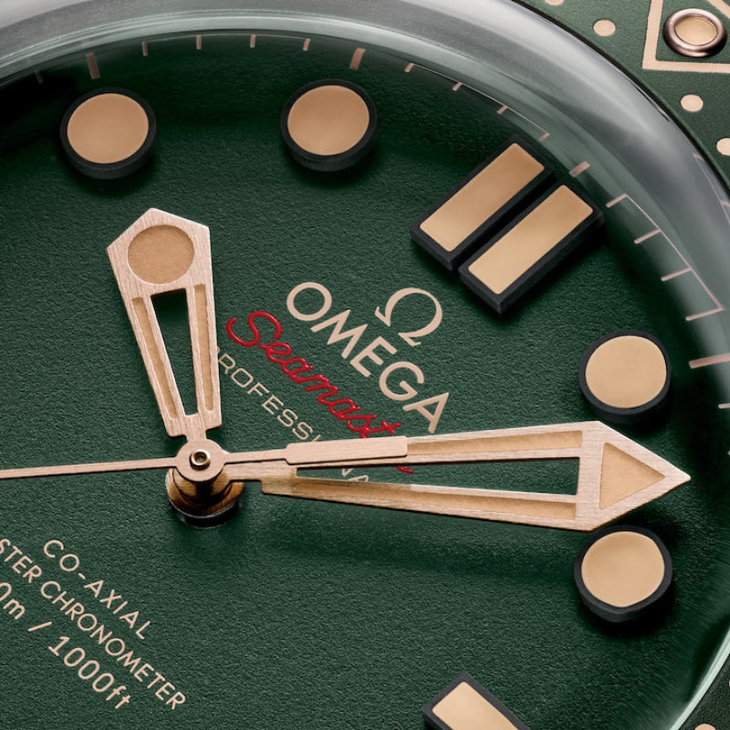 O Seamaster Diver 300M combina o legado marítimo com design e inovação modernos. Este modelo de 42 mm é feito em titânio grau 2 e Ouro Bronze, com luneta verde em alumínio anodizado e mostrador verde jateado. Possui ponteiros em Ouro Bronze e índices com Super-LumiNova vintage. Acompanha bracelete de malha escovada e é movido pelo calibre Co-Axial Master Chronometer 8806, visível através do fundo em vidro de safira com detalhes ondulados.